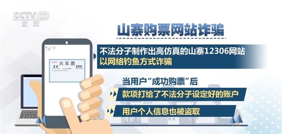 山寨購票網(wǎng)站詐騙:不法分子制作出高仿真的山寨12306網(wǎng)站,以網(wǎng)絡(luò)釣魚方式詐騙,這些網(wǎng)站在頁面布局、域名上與12306網(wǎng)站非常相似。當(dāng)用戶“成功購票”后,款項(xiàng)打給了不法分子設(shè)定好的賬戶,用戶個(gè)人信息也被盜取。