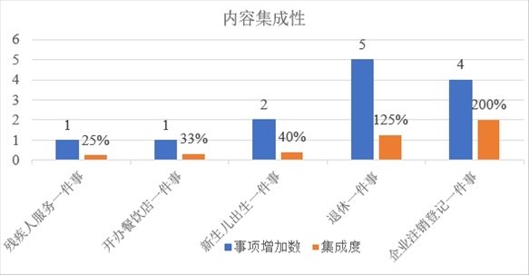 從內(nèi)容集成度看,5項(xiàng)相關(guān)“一件事”的事項(xiàng)集成比例均有不同程度提升?!皻埣踩朔?wù)一件事”增加1個(gè)事項(xiàng),集成度提升25%?!伴_辦餐飲店一件事”增加1個(gè)事項(xiàng),集成度提升33%。“新生兒出生一件事”增加2個(gè)事項(xiàng),集成度提升40%?!巴诵菀患隆痹黾?個(gè)事項(xiàng),集成度提升125%?!捌髽I(yè)注銷登記一件事”增加4個(gè)事項(xiàng),集成度提升200%。