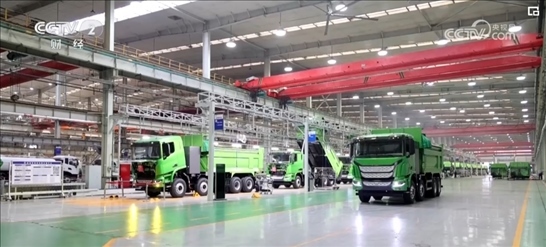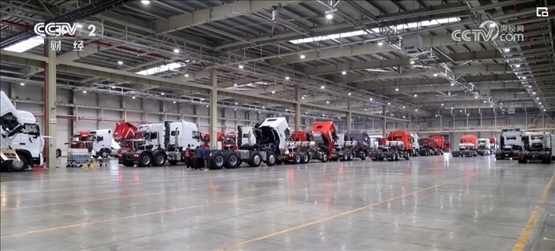 在山東濟(jì)南一家重卡生產(chǎn)企業(yè)的總裝車間里,貨運(yùn)機(jī)器人將重卡的車架依次傳送到各工作站,工人熟練地將發(fā)動(dòng)機(jī)、散熱器、輪胎等零件加裝到車架上。工作人員介紹,一輛重卡從接到訂單開(kāi)始排產(chǎn)到交付客戶僅需五六天。