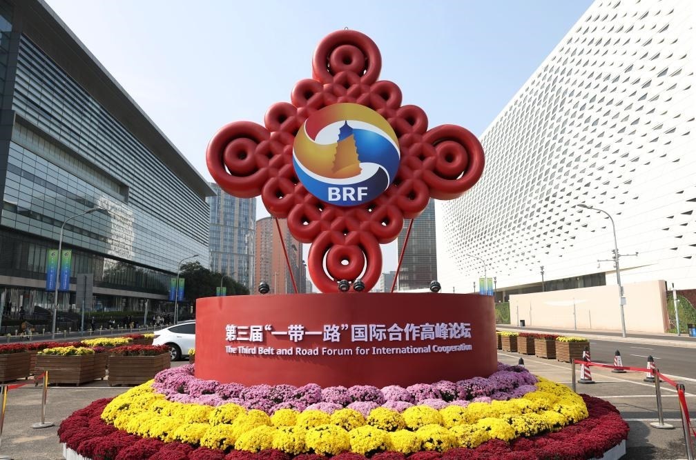 這是2023年10月17日在北京國家會議中心附近拍攝的“一帶一路”國際合作高峰論壇景觀布置。新華社記者 陳斌 攝