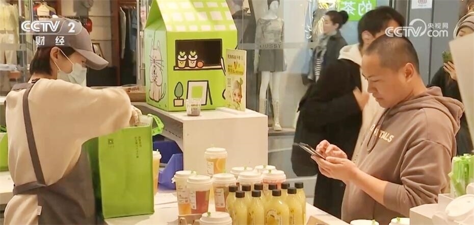 記者又探訪了北京另一處商圈。在這家茶飲門店,前來取餐的外賣騎手絡(luò)繹不絕,店內(nèi)也坐滿了堂食的顧客。
