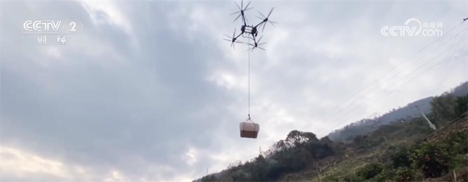 在湖北宜昌興山縣秀龍村,眼下的橙子采收也用上了新工具。裝有鉤子的無人機(jī)飛到柑橘地上空,村民用鉤子勾住裝有100斤鮮橙的筐子。隨后,無人機(jī)就將這些鮮橙運(yùn)到了公路邊的貨車上。這樣的無人機(jī)一天可以運(yùn)輸3萬斤橙子,完成了超過16人的工作量,節(jié)約了2500元以上的成本。