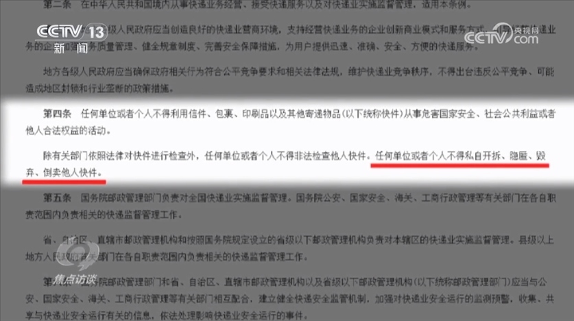 國務(wù)院頒布的《快遞暫行條例》第四條明確規(guī)定:“任何單位或者個人不得私自開拆、隱匿、毀棄、倒賣他人快件。”