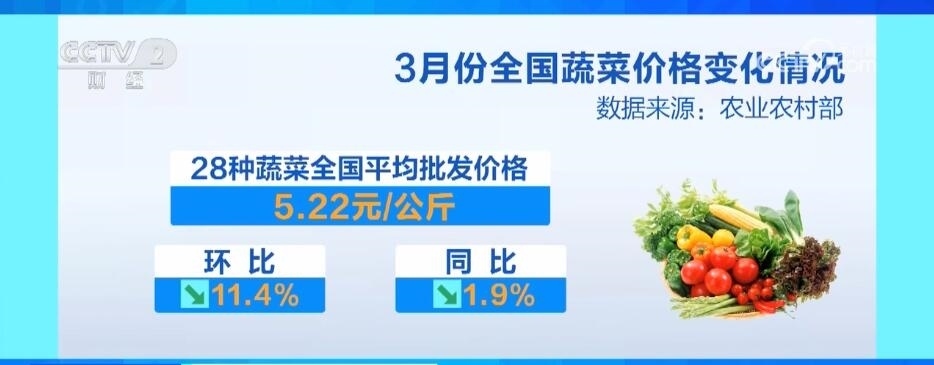 央視網(wǎng)消息:農(nóng)業(yè)農(nóng)村部發(fā)布的3月份全國“菜籃子”指數(shù)為126.44,環(huán)比下降9.47個點(diǎn),同比下降7.57個點(diǎn),其中蔬菜價(jià)格呈現(xiàn)季節(jié)性下降。