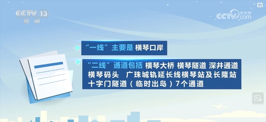 “一線”主要是橫琴口岸,“二線”通道包括橫琴大橋、橫琴隧道、深井通道、橫琴碼頭、廣珠城軌延長線橫琴站及長隆站、十字門隧道(臨時出島)7個通道。