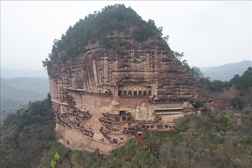 4月5日,游客在位于天水市麥積區(qū)的麥積山石窟游覽(無人機(jī)照片)。新華社 圖