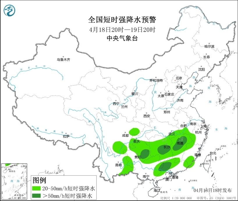 預計4月18日20時至19日20時,貴州中東部、湖南中南部、江西、浙江西南部、廣西北部、廣東北部、福建南部等地的部分地區(qū)將有8-10級雷暴大風或冰雹天氣,其中貴州東部、湖南中南部、江西中北部、廣西東北部、廣東北部等地的部分地區(qū)將有10級以上雷暴大風,局地風力可達11級以上;四川東部和南部、重慶南部、貴州、湖北東南部、安徽南部、湖南、江西、浙江西部、福建西北部和南部、云南東南部、廣西東北部、廣東北部等地將有小時雨量大于20毫米的短時強降水天氣,其中貴州東部、湖南中南部、江西中部、廣東中北部等地的部分地區(qū)最大小時雨量大于50毫米,局地可達70毫米以上。