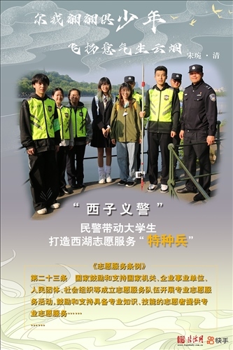 浙江省杭州市公安局西湖風(fēng)景名勝區(qū)分局組織公安巡特警、消防、交警、行政執(zhí)法、平安志愿者等各方力量參與社會治理工作,逐漸壯大的“西子義警”隊伍已成為西湖邊守望平安的重要力量。近期,一群朝氣蓬勃的青年大學(xué)生加入“西子義警”隊伍,共同營造更加和諧的西湖景區(qū)平安環(huán)境。