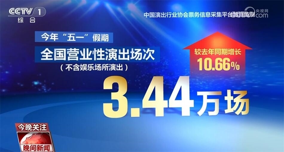 “五一”假期,以沉浸式體驗、場景式消費為突出特點的演藝新空間受到年輕觀眾的喜愛,為演藝產(chǎn)業(yè)的創(chuàng)新和發(fā)展注入了新活力。據(jù)中國演出行業(yè)協(xié)會票務信息采集平臺數(shù)據(jù)監(jiān)測,今年“五一”假期,全國營業(yè)性演出(不含娛樂場所演出)場次3.44萬場,較去年同期增長10.66%,票房收入20.84億元,同比增長37.17%,觀演人次1026.73萬人,同比增長18.63%。