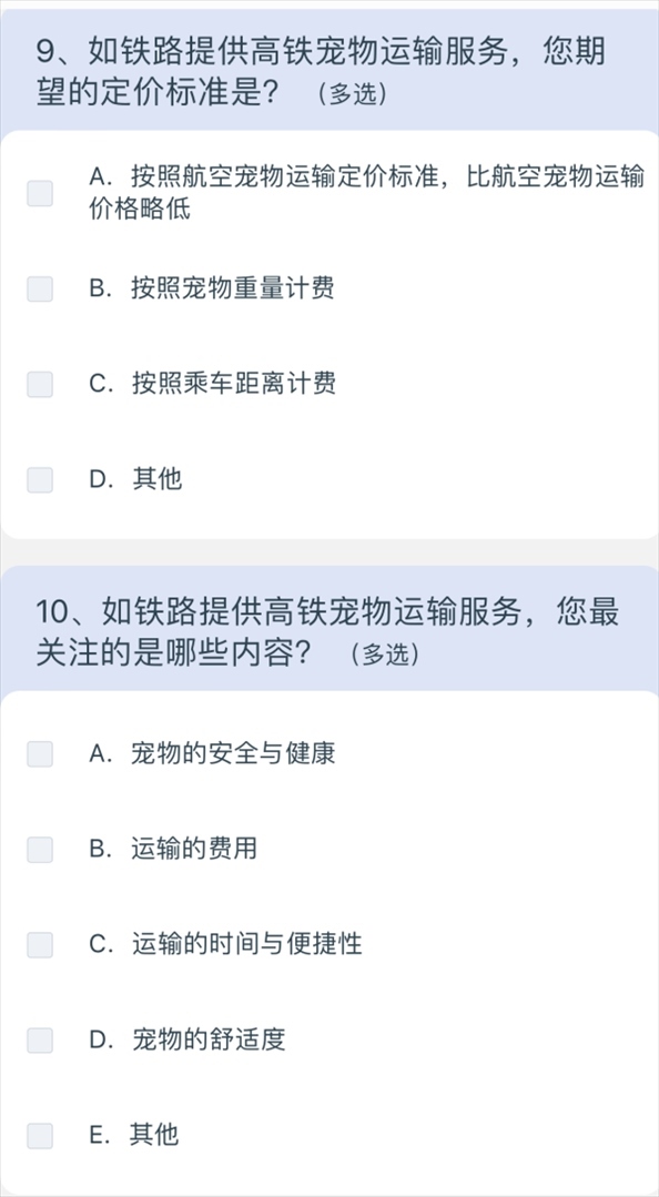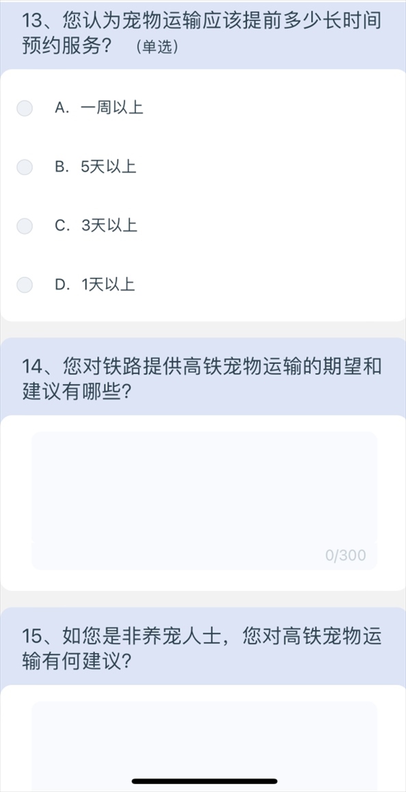 5月10日上午8點40分,澎湃新聞記者通過掃描網友分享的列車上的二維碼,進入12306系統(tǒng),選擇問卷·建議,進入“鐵路旅客高鐵寵物運輸”調查,共15個問題,涉及養(yǎng)寵類型、是否有攜帶寵物出行的需求、如果鐵路提供寵物運輸服務是否愿意嘗試等,以及為降低對其他旅客的影響,在高鐵寵物運輸更關注哪方面的防護;如鐵路提供高鐵寵物運輸服務,期望的定價標準;如鐵路提供高鐵寵物運輸服務,最關注的內容;如果是非養(yǎng)寵人士,對高鐵寵物運輸有何建議等多方面問題。