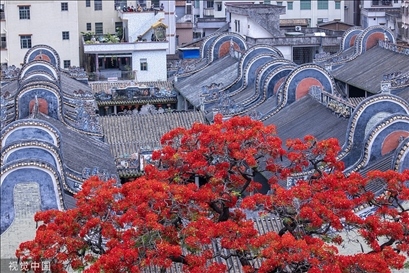 廣州市,白云區(qū)龍歸南村周氏大宗祠鳳凰花開(kāi),嶺南鑊耳屋頂與火紅的鳳凰花交相輝映。
