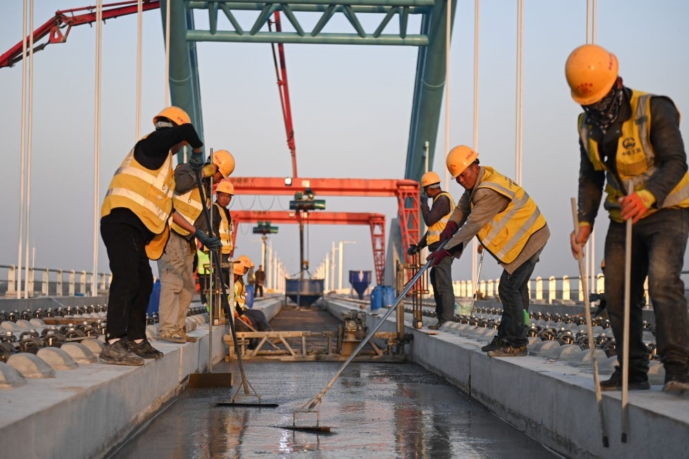 2024年3月20日,中鐵三局建設(shè)者在滬蘇湖鐵路東苕溪特大橋上施工。滬蘇湖鐵路起自上海虹橋站,途經(jīng)江蘇省蘇州市,終至浙江省湖州市湖州站。項(xiàng)目建成運(yùn)營(yíng)后,將進(jìn)一步完善區(qū)域路網(wǎng)布局,促進(jìn)沿線經(jīng)濟(jì)社會(huì)發(fā)展和長(zhǎng)三角一體化高質(zhì)量發(fā)展。新華社記者 黃宗治 攝
