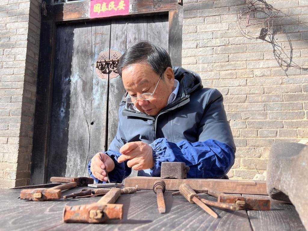 還沒進門,院里就傳來“唿噠唿噠”的手拉風箱聲,裴向南的老搭檔正忙著生火,一推一拉,火苗呼呼地竄起。一旁的裴師傅則不緊不慢地準備著制針的工具。院落中央的老樹下,小木桌被熟練地支起,小錘、銼刀等一字排開、整齊碼放,足足有十幾件。“都是祖?zhèn)鞯膶氊?,用了好多年?!?/p>