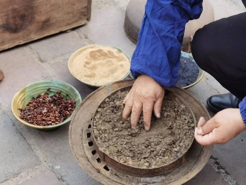 沖好針孔,便在磨石上反復銼尖。隨后倒入熱鍋里翻炒,再舀入一瓢水,針的剛性和硬度由此增加。接下來便輪到三大碗“大陽秘方”登場:白崖土粉末、松木炭和發(fā)酵后的豆豉,用于蒸針?!八赡咎靠梢栽黾愉撫樀暮剂?,提升硬度;豆豉增加亮度;白崖土粉末作為分散劑讓針受熱均勻。這樣處理后可以保證針質(zhì)更堅硬又有光澤?!?/p>