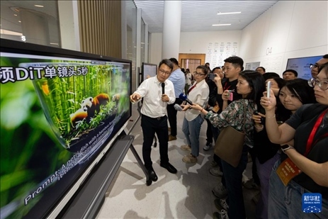 ?5月23日,大模型企業(yè)、智象未來生態(tài)合作部總經(jīng)理沈偉峰為采訪團(tuán)介紹運(yùn)用大模型文生視頻。新華社記者 王翔 攝