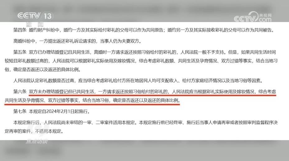 陜西省韓城市人民法院芝陽人民法庭庭長王春妮:“我們跟原告充分釋法明理,讓他知道咱們國家有新的規(guī)定,對他經過反復做工作,他也降低了自己的心理預期。被告這邊認為我跟你在一起共同生活了,我也是實心想跟你過日子,但是因為沒有領證,而且我還跟你共同生育了一個孩子,你現(xiàn)在要求我給你返還彩禮,我就不愿意返還,心里有抵抗情緒?!?/p>