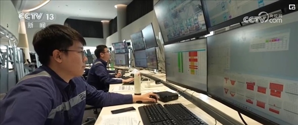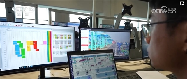 作為系統(tǒng)優(yōu)化師,范春奇全神貫注地盯著3個屏幕。左邊屏幕是碼頭調度指令,右邊是現(xiàn)場監(jiān)控的實時畫面,中間是智能水平運輸系統(tǒng),顯示著所有車輛的運行軌跡。