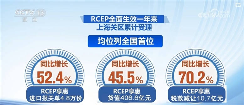 在上海,RCEP全面生效一年來,上海關(guān)區(qū)累計受理RCEP享惠進口報關(guān)單4.8萬份,貨值406.6億元,稅款減讓10.7億元,均位列全國首位,同比分別增長52.4%、45.5%和70.2%,