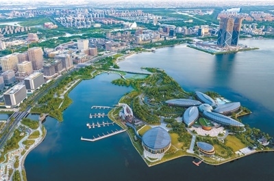 擴大開放上海自貿(mào)試驗區(qū)臨港新片區(qū)滴水湖畔,鱗次櫛比的樓宇拔地而起。計海新攝(影像中國)