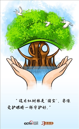 “國(guó)寶”一詞強(qiáng)調(diào)了紅樹(shù)林不可估量的價(jià)值,及其在國(guó)家發(fā)展中的重要地位?!跋駩?ài)護(hù)眼睛一樣守護(hù)好”,則重申了保護(hù)紅樹(shù)林的緊迫性和重要性。