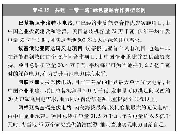持續(xù)推動“一帶一路”綠色能源合作。中國發(fā)布《關于推進共建“一帶一路”綠色發(fā)展的意見》等政策文件,與共建“一帶一路”國家積極拓展綠色能源領域合作。2021年,中國宣布不再新建境外煤電項目,綠色低碳能源已成為中國在共建國家能源合作重點。中國與100多個國家和地區(qū)開展綠色能源項目合作,一大批標志性能源項目和惠民生的“小而美”項目落地生根,有效解決了所在國用電難、用電貴等問題,為所在國提供了清潔、安全、可靠的能源供應方案。