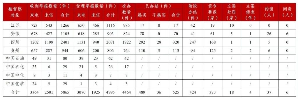 截至10月30日20時,各督察組共收到群眾來電、來信舉報5865件,受理有效舉報4995件,經(jīng)梳理合并重復(fù)舉報,累計向被督察對象轉(zhuǎn)辦4464件。被督察對象已辦結(jié)或階段辦結(jié)949件,其中立案處罰18家;立案偵查4件;約談黨政領(lǐng)導(dǎo)干部37人,問責(zé)黨政領(lǐng)導(dǎo)干部6人。