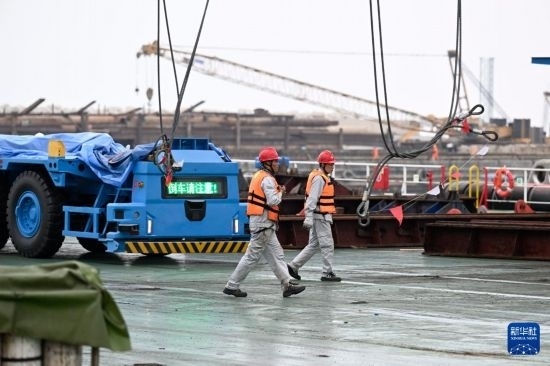 6月27日,岸邊集裝箱起重機(jī)和軌道吊運(yùn)抵秘魯錢凱港。 新華社發(fā)(上海振華重工供圖)