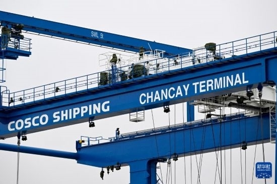 這是6月21日在秘魯錢凱港拍攝的印有“中遠(yuǎn)海運(yùn),錢凱碼頭”字樣的軌道吊。 新華社記者 李木子 攝