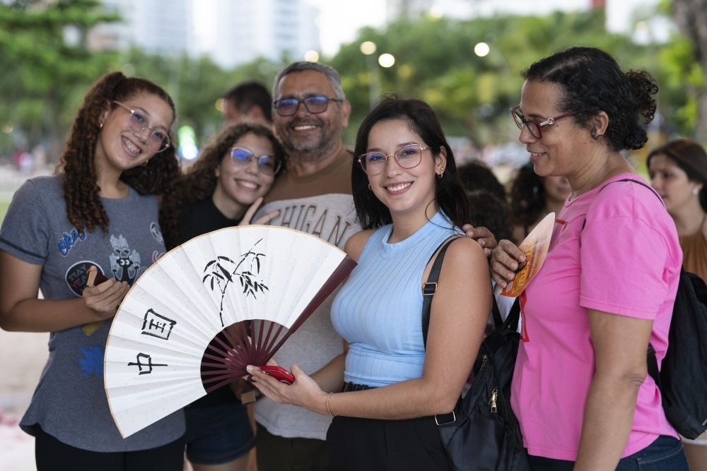 2024年2月3日,一名女子在巴西累西腓舉行的中國(guó)春節(jié)慶?;顒?dòng)上展示自己書寫的扇面。