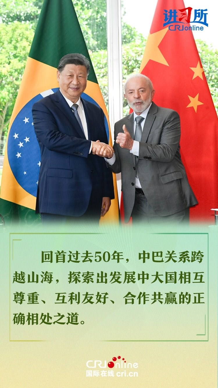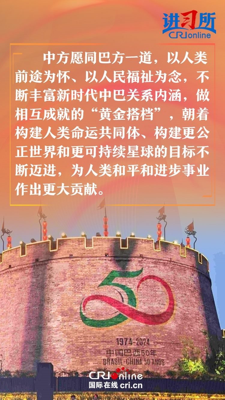 今年是中巴建交50周年。習近平指出,回首過去50年,中巴關(guān)系跨越山海,探索出發(fā)展中大國相互尊重、互利友好、合作共贏的正確相處之道。中方愿同巴方一道,以人類前途為懷、以人民福祉為念,不斷豐富新時代中巴關(guān)系內(nèi)涵,做相互成就的“黃金搭檔”,朝著構(gòu)建人類命運共同體、構(gòu)建更公正世界和更可持續(xù)星球的目標不斷邁進,為人類和平和進步事業(yè)作出更大貢獻。