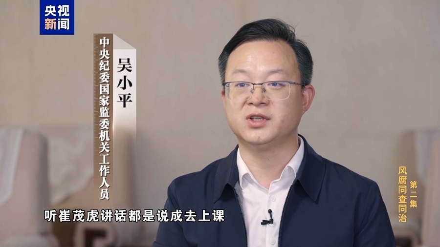中央紀(jì)委國家監(jiān)委機(jī)關(guān)工作人員 吳小平:崔茂虎特別能講,講起工作來都是長篇大論的,所以麗江當(dāng)?shù)匾恍└刹棵看稳ラ_會,聽崔茂虎講話都說成去上課,去聽崔老師講課,實(shí)際上散了會就開始到別墅里面跟商人老板在一起吃喝玩樂。