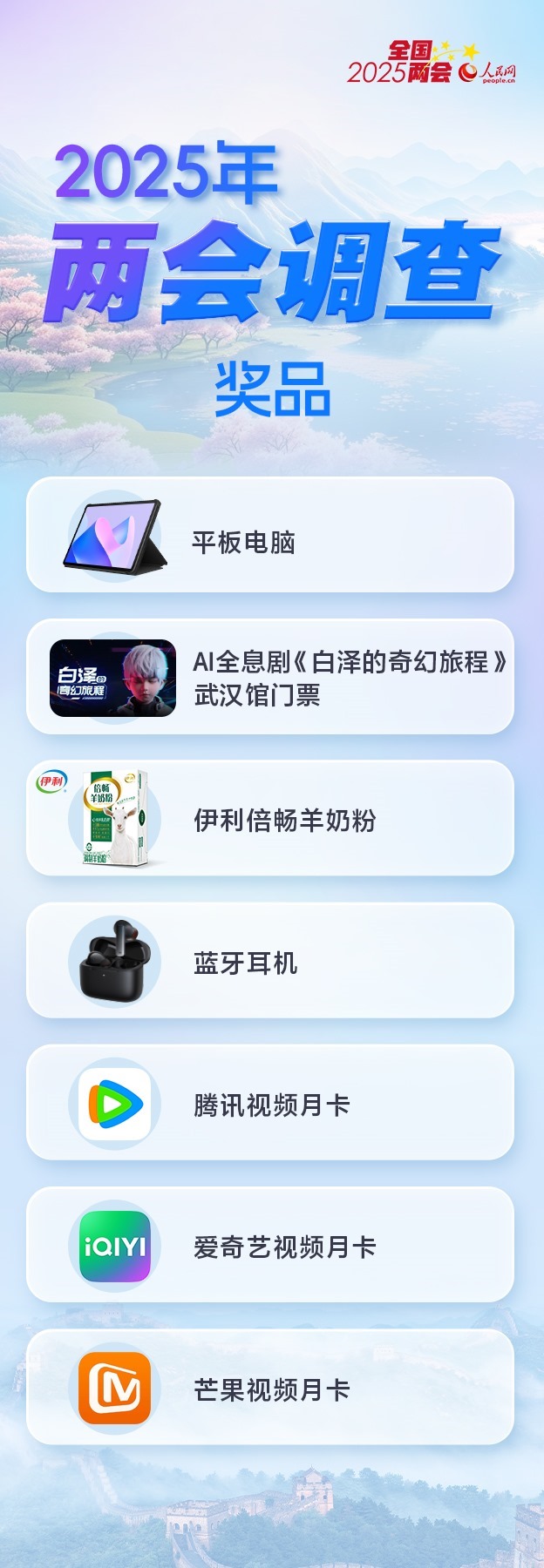 調(diào)查還在火熱進(jìn)行,各界可繼續(xù)通過(guò)人民網(wǎng)全媒體通道參與本次調(diào)查。為感謝網(wǎng)友對(duì)人民網(wǎng)2025年全國(guó)兩會(huì)調(diào)查的支持,參與者有機(jī)會(huì)抽取精美獎(jiǎng)品。