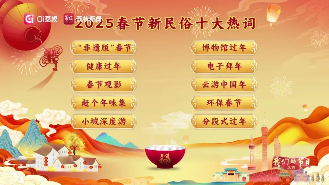 活動(dòng)接近尾聲之際,2025年“春節(jié)新民俗十大熱詞”評(píng)選環(huán)節(jié)正式開啟。通過深入分析微博、微信、抖音及人民網(wǎng)、中國精神文明網(wǎng)、學(xué)習(xí)強(qiáng)國、ai荔枝、荔枝新聞等網(wǎng)絡(luò)平臺(tái)上的互動(dòng)留言及熱度指數(shù),與新民俗相關(guān)的20個(gè)高頻熱詞脫穎而出。在短短四天內(nèi),數(shù)十萬網(wǎng)友踴躍參與了網(wǎng)絡(luò)投票。截至2月12日15時(shí),投票總數(shù)已飆升至764832票,當(dāng)晚“我們的節(jié)日 歡樂中國年”乙巳蛇年元宵特別節(jié)目中,春節(jié)新民俗十大熱詞火熱揭曉。“‘非遺版’春節(jié)”、“健康過年”、“春節(jié)觀影”等熱詞以高票數(shù)位居前列。