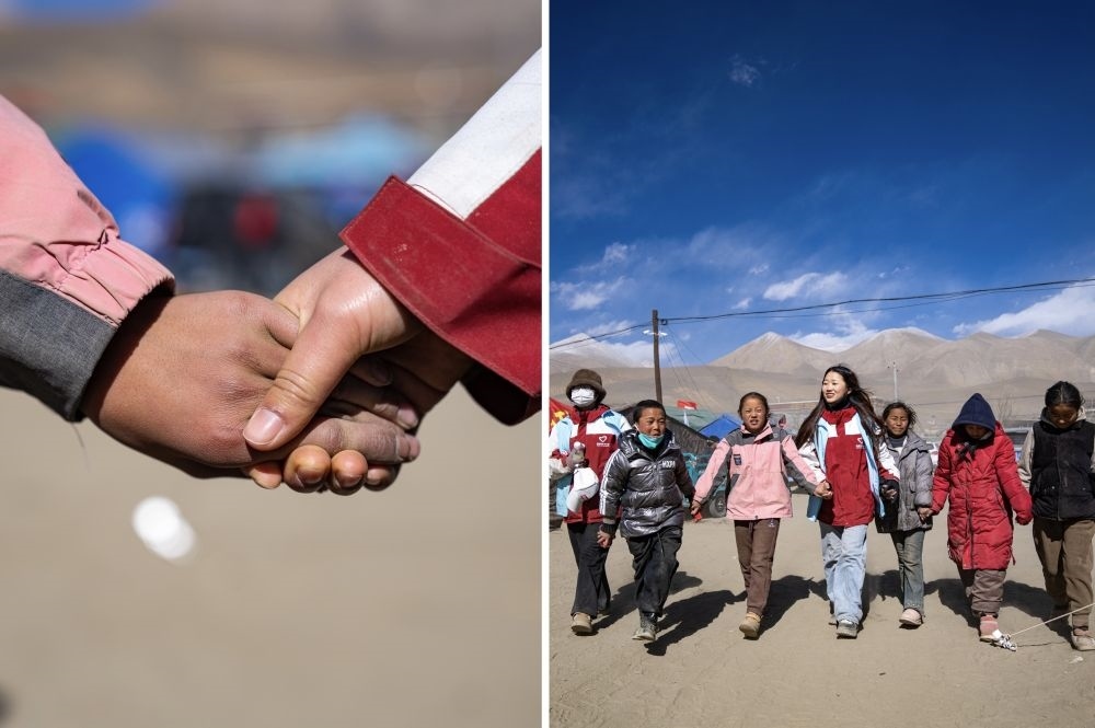 在西藏日喀則市定日縣長(zhǎng)所鄉(xiāng)森嘎村,西部計(jì)劃志愿者周漣笛和地震災(zāi)區(qū)孩子們?cè)谝黄?,幫助他們疏?dǎo)心理(拼版照片,2025年1月13日攝)。新年伊始,一場(chǎng)突如其來(lái)的地震打破了高原的寧?kù)o。眾多志愿服務(wù)力量緊急奔赴,為受災(zāi)群眾帶來(lái)溫暖和力量。