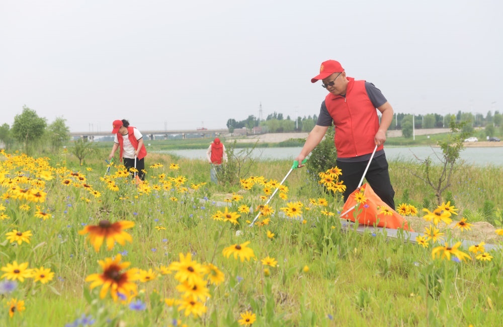 2024年6月5日,環(huán)保志愿者在河北省石家莊新樂(lè)市磁河木刀溝生態(tài)濕地?fù)焓袄?/span>