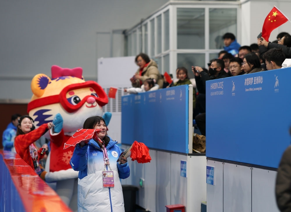 2025年2月11日,志愿者和吉祥物“妮妮”在第九屆亞冬會(huì)的一場(chǎng)比賽前與觀眾互動(dòng)。