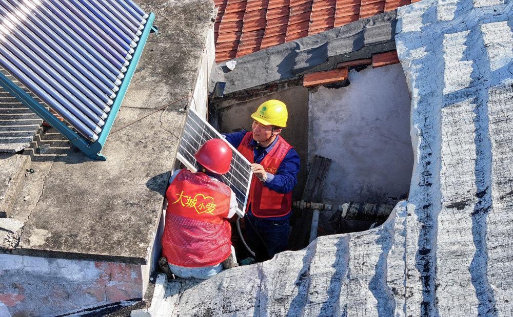 2025年3月2日,浙江余姚大城小愛(ài)公益服務(wù)中心志愿者在一老舊小區(qū)開(kāi)展太陽(yáng)能照明公益改造,照亮老社區(qū)居民的回家路(無(wú)人機(jī)照片)。