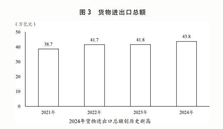 (六)加快建設更高水平開放型經濟新體制,高水平對外開放取得積極成效。全年貨物進出口總額43.8萬億元,服務進出口總額7.5萬億元,外商直接投資1162億美元,境外直接投資1438億美元。年末外匯儲備規(guī)模達32024億美元。