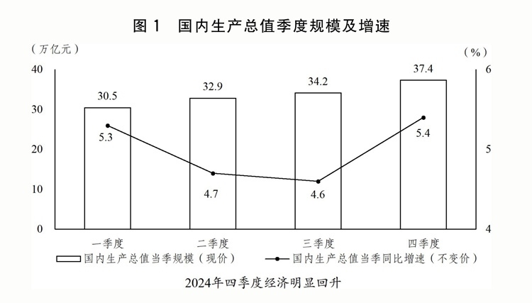 (一)因時因勢加強和創(chuàng)新宏觀調控,推動經濟回升向好。扎實開展宏觀政策逆周期調節(jié),加大政策力度,釋放政策效能,特別是9月26日中央政治局會議果斷部署一攬子增量政策,市場預期、社會信心有效提振,四季度經濟明顯回升。全年國內生產總值(GDP)134.9萬億元、增長5%,其中,一、二、三產業(yè)分別增長3.5%、5.3%、5%。