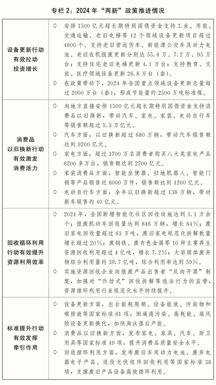 四是加力擴圍實施“兩新”政策。安排超長期特別國債5000億元支持大規(guī)模設備更新和消費品以舊換新,統(tǒng)籌投資、財政、金融等綜合性政策,深入推進設備更新、消費品以舊換新、回收循環(huán)利用、標準提升四大行動。進一步加大重點領域設備更新項目支持力度,加力實施設備更新貸款貼息,加快存量設備評估診斷和項目儲備。進一步支持消費品以舊換新,擴大汽車報廢更新支持范圍,完善汽車置換更新補貼標準,實施手機、平板等數(shù)碼產品購新補貼,積極支持家裝消費品換新,簡化補貼申領和支付流程,完善資金監(jiān)管機制,嚴厲打擊價格欺詐和違規(guī)騙補套補行為。