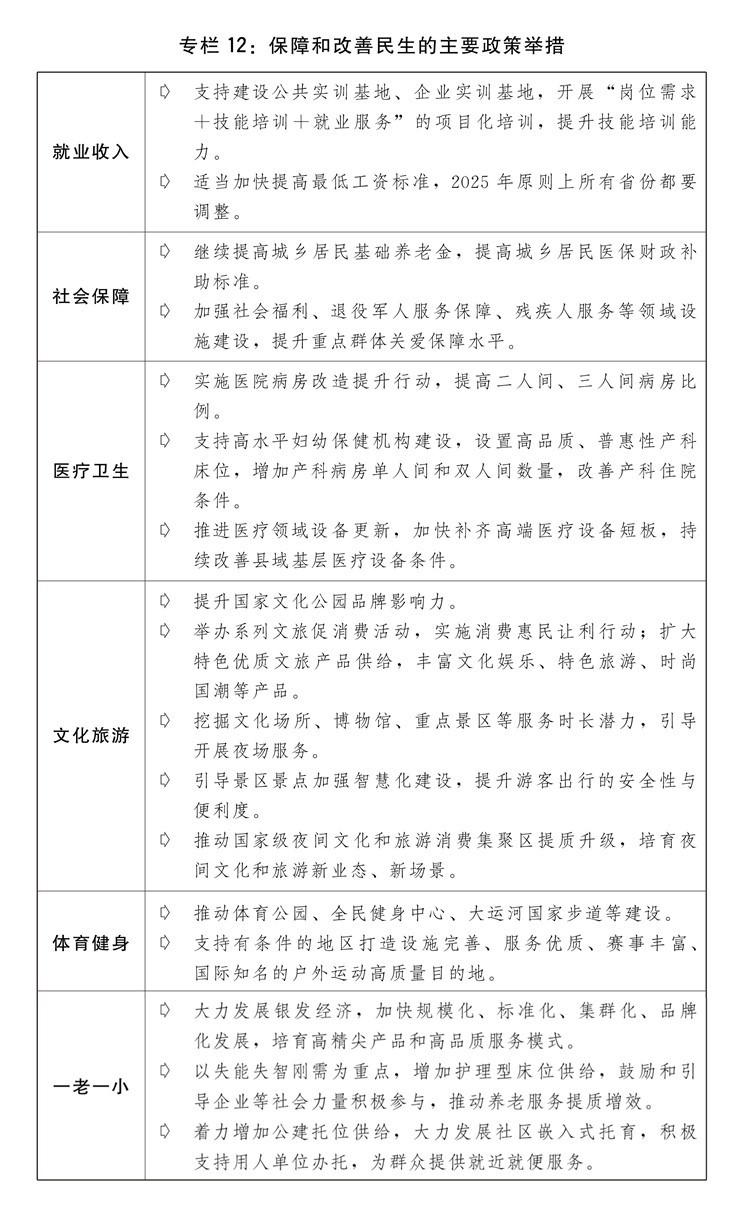 一是實施提振消費專項行動。制定提升消費能力、增加優(yōu)質供給、改善消費環(huán)境政策舉措,穩(wěn)定大宗消費、擴大服務消費、拓展新型消費、合理增加公共消費,推動消費提質升級。多渠道促進居民增收,推動中低收入群體增收減負,完善勞動者工資正常增長機制。因城施策調減房地產消費限制性措施,推動建設安全、舒適、綠色、智慧的“好房子”,更好滿足人民群眾剛性和改善性住房需求、高品質居住需要。進一步優(yōu)化汽車限購管理政策,加快構建充電基礎設施體系,開展汽車流通消費改革試點。加快拓展文化、旅游、體育、健康、養(yǎng)老、托幼、家政、數(shù)字等服務消費,實施服務消費提質惠民活動、“百城百區(qū)”文化和旅游消費行動計劃。加快培育帶動性廣、顯示度高的消費新場景,支持影視游戲創(chuàng)作與中華優(yōu)秀傳統(tǒng)文化、特色旅游資源相結合等融合式沉浸式消費新場景發(fā)展。積極發(fā)展首發(fā)經濟、冰雪經濟、銀發(fā)經濟。完善游艇、房車露營等新型消費領域管理機制和行業(yè)標準,促進“人工智能+消費”,優(yōu)化消費新業(yè)態(tài)新領域市場準入環(huán)境,加快推動各類新技術應用推廣并向消費級產品轉化。清理對消費的不合理限制。深入實施優(yōu)化消費環(huán)境三年行動,加強消費信用體系和質量標準體系建設,規(guī)范網(wǎng)絡銷售、直播帶貨領域不合理經營行為,強化消費者權益保護。落實和優(yōu)化帶薪年休假制度。完善外國人入境居留政策和免稅店政策,推動擴大入境消費。深化國際消費中心城市建設。