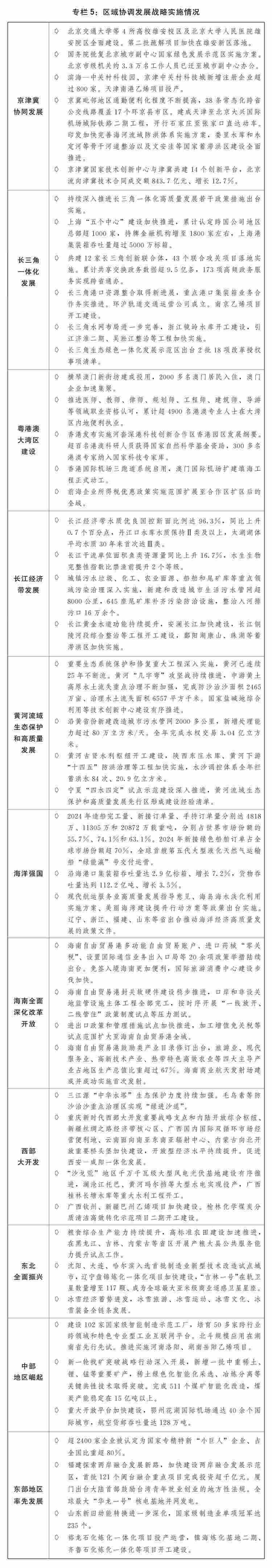 一是區(qū)域協(xié)調發(fā)展積厚成勢。京津冀協(xié)同發(fā)展走深走實,在京相關高校、醫(yī)院、中央企業(yè)總部及二三級子公司分批向雄安新區(qū)疏解,北京城市副中心行政辦公、商務服務、文化旅游等功能不斷完善,進一步支持天津濱海新區(qū)高質量發(fā)展若干政策措施出臺實施,三省市互聯(lián)互通交通網(wǎng)絡更加完善、產業(yè)鏈上下游協(xié)作持續(xù)強化、公共服務共建共享水平進一步提升。長三角一體化高質量發(fā)展深入推進,生態(tài)綠色一體化發(fā)展示范區(qū)改革授權壓茬推進,港口資源整合、軌道互聯(lián)互通等取得新進展,上海“五個中心”建設進一步加快。粵港澳大灣區(qū)建設邁上新臺階,橫琴粵澳深度合作區(qū)封關“一線”“二線”分線管理運行順利,超1.6萬名澳門居民在合作區(qū)居住生活,支持河套深港科技創(chuàng)新合作區(qū)深圳園區(qū)、香港園區(qū)聯(lián)動發(fā)展,創(chuàng)新要素跨境流動更加便捷。長江經濟帶共抓大保護、不搞大開發(fā)成效顯著,進一步抓實抓好長江大保護工作三年行動計劃出臺實施,長江十年禁漁取得明顯成效,長江干流連續(xù)5年保持Ⅱ類水質,綜合立體交通走廊加快構建,沿江高鐵全線開工建設。黃河流域生態(tài)保護和高質量發(fā)展邁出堅實步伐,農業(yè)面源、城鎮(zhèn)生活、工業(yè)和尾礦庫污染治理深入推進,8萬余個入河排污口開展溯源整治,一批生態(tài)保護修復重點項目加快建設,黃河干流連續(xù)3年保持Ⅱ類水質。海洋強國建設深入推進,海洋強省、現(xiàn)代海洋城市、全國海洋經濟發(fā)展示范區(qū)創(chuàng)新發(fā)展,海洋生態(tài)環(huán)境質量持續(xù)改善,海洋生產總值超10萬億元。