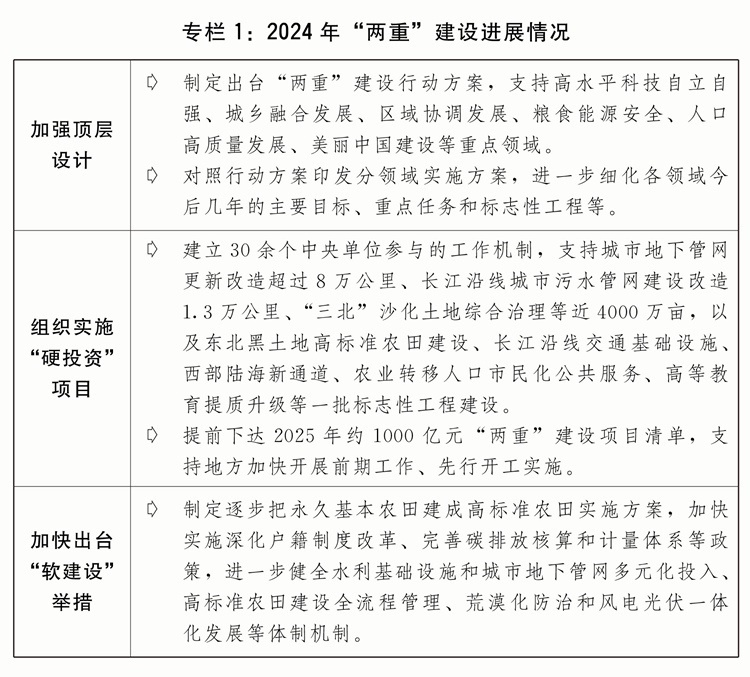 三是加力推進“兩重”建設。進一步完善自上而下的工作機制,加強“兩重”建設項目儲備,更好統(tǒng)籌“硬投資”與“軟建設”。安排超長期特別國債8000億元支持“兩重”建設,進一步優(yōu)化具體投向并提高項目支持比例,重點支持基礎研究能力提升、未來產業(yè)發(fā)展、東北等重點地區(qū)高標準農田建設、大中型灌區(qū)新建改造及大中型引調水和大中型水庫建設、長江經濟帶生態(tài)環(huán)境保護和綠色發(fā)展、農業(yè)轉移人口市民化公共服務體系建設、高等教育提質升級、城市地下管網(wǎng)管廊建設改造等方面任務,強化超長期貸款等配套融資,高質量推進“硬投資”項目謀劃實施。加大力度推動“軟建設”政策落地見效。