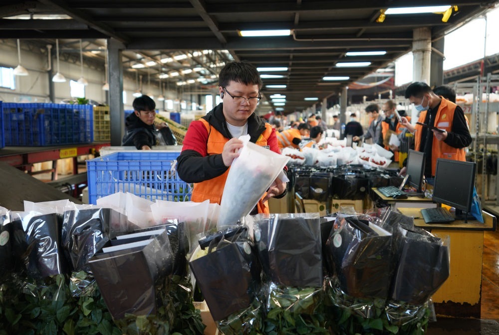 2022年11月11日,工作人員在昆明斗南花市給鮮花貼標(biāo)簽??爝f物流時(shí)效不斷優(yōu)化、冷鏈運(yùn)輸技術(shù)持續(xù)提升,也為中國鮮花加速“出?!北q{護(hù)航。