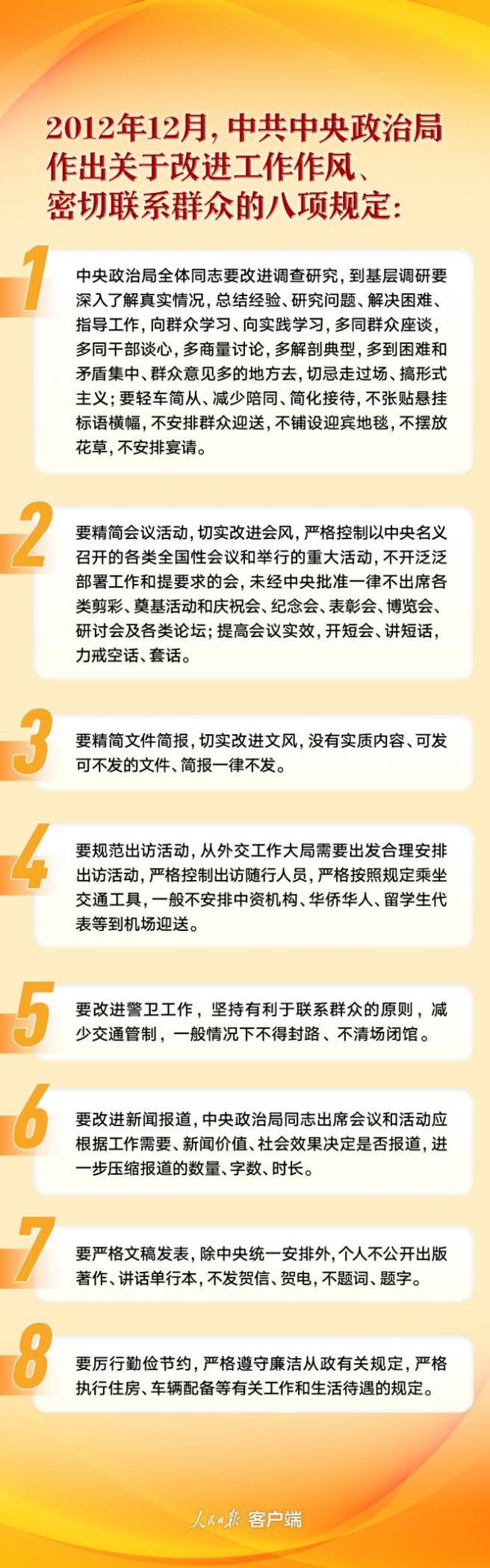 “中央八項(xiàng)規(guī)定不是五年、十年的規(guī)定,而是長(zhǎng)期有效的鐵規(guī)矩、硬杠杠?!笔嗄陙?lái),以習(xí)近平同志為核心的黨中央始終把持之以恒貫徹執(zhí)行中央八項(xiàng)規(guī)定精神、加強(qiáng)作風(fēng)建設(shè)放在突出位置來(lái)抓,作出了一系列重大決策部署。