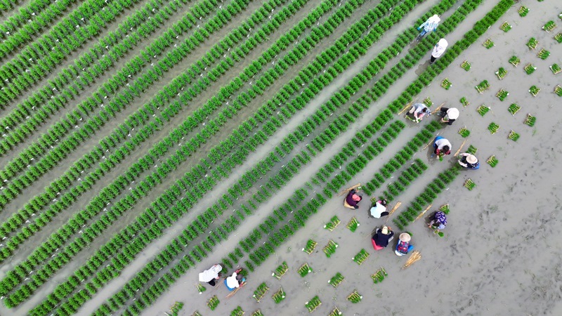 6月14日,在江蘇里下河地區(qū)農(nóng)科所(揚州市農(nóng)科院),農(nóng)民在田里起秧、運秧(無人機照片)。