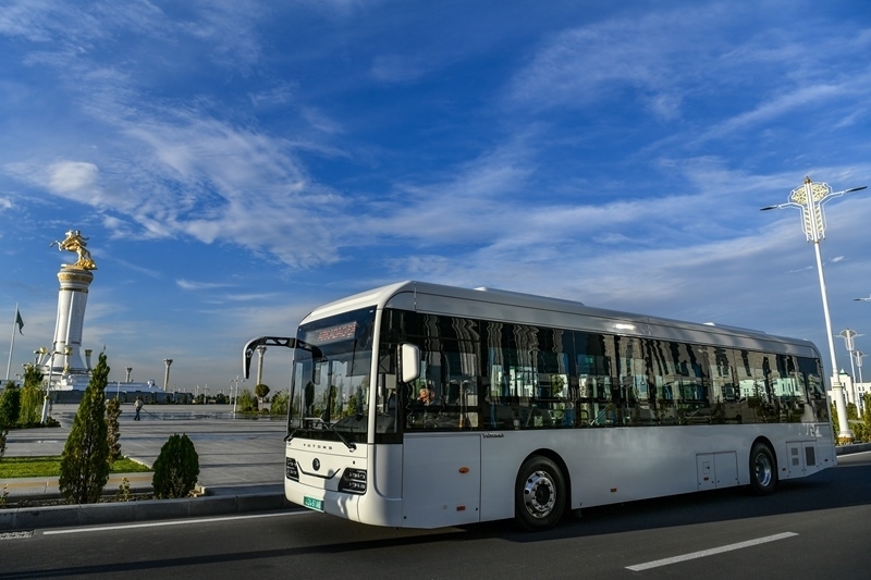 這是2023年11月26日在土庫曼斯坦阿爾卡達格拍攝的電動公交車。新華社記者 曹陽 攝