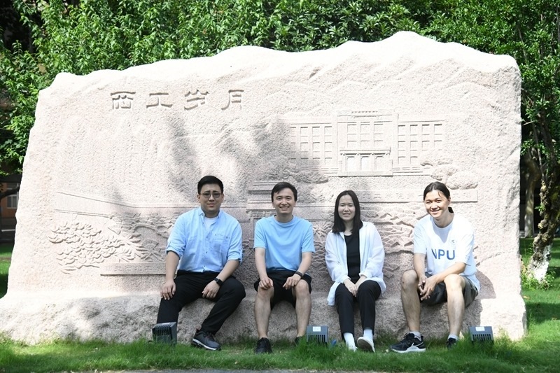 2024年6月26日,西工大哈薩克斯坦分校學生道托夫·鐵木爾、博雷斯別克·穆拉特、伊薩耶娃·豪哈爾和圖列加利·阿米爾(從左至右)在位于陜西西安的西北工業(yè)大學本部校園內(nèi)合影。新華社記者 張博文 攝