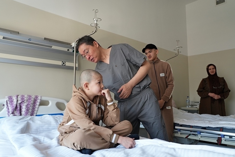 2025年2月20日,在位于烏茲別克斯坦塔什干的共和國耳鼻喉科及頭頸疾病專業(yè)科學實踐醫(yī)療中心,劉玉和醫(yī)生(左二) 在術(shù)前查看患兒情況。新華社發(fā)(扎法爾?攝)