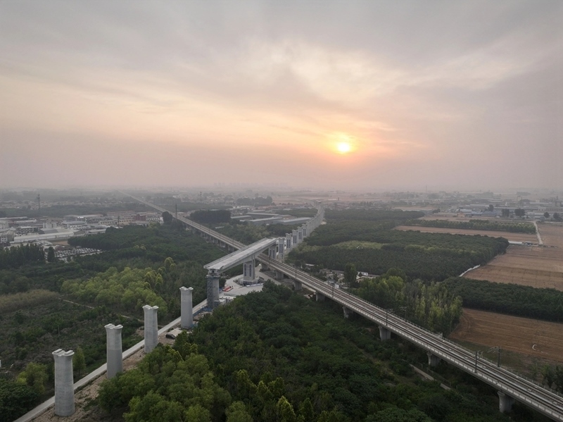 轉(zhuǎn)體前的雄忻高鐵雄保段跨京廣高鐵轉(zhuǎn)體橋(6月17日攝,無人機(jī)照片)。
